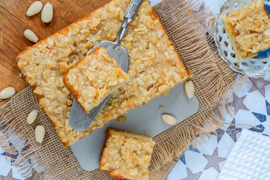 Blatul este, de obicei, unul simplu, pe bază de ouă, zahăr, unt, făină și lapte. Nu este uscat, dar nici foarte dens, fiind gândit să susțină toppingul fără să se lase. Aroma este delicată, ușor vanilată, tocmai pentru a lăsa migdalele caramelizate să fie vedetele desertului. Tocmai această simplitate o face ideală pentru oricine, chiar și pentru cei care nu sunt mari fani ai prăjiturilor foarte dulci.
